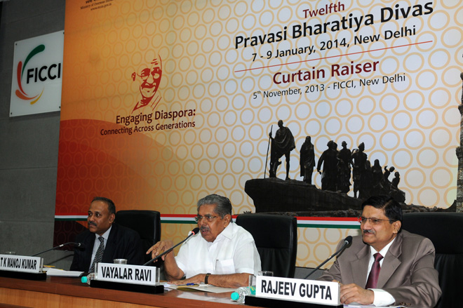 The Union Minister for Overseas Indian Affairs, Shri Vayalar Ravi addressing a press conference to brief regarding forthcoming edition of Pravasi Bharatiya Divas to be held in Delhi, in New Delhi on November 05, 2013.
